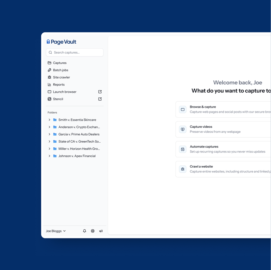 For over a decade, Page Vault has been the trusted standard for IP professionals capturing online evidence. From trademark infringement to false advertising, Page Vault helps teams preserve critical digital content—websites, social media, and videos—in a way that stands up in federal court. Our authenticated captures, complete with detailed metadata and audit trails, ensure your evidence is as strong as your case.